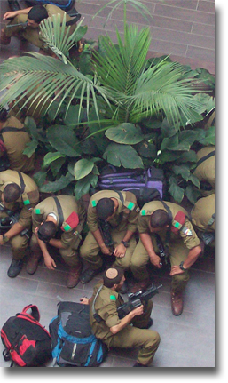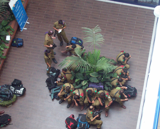El primer día de la semana (domingo en Occidente) los soldados israelíes vuelven a sus bases luego de pasar el Shabat en familia. Durante las primeras horas de la mañana de ese día, las calles lucen abarrotadas de los jóvenes –casi niños, en verdad– sobre cuyos hombros recae la seguridad de un país siempre bajo amenaza. Cada israelí fue o irá al servicio militar. Todos en algún momento tendremos un vecino soldado, aunque para comenzar solo sea en el autobús del domingo por la mañana.