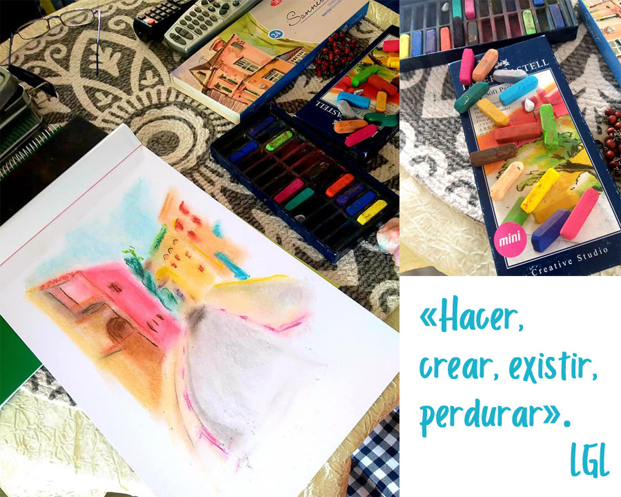 La magia de Yafo se traslada a mis lienzos. Incontables recorridos entre callecitas, que llevan a lo incógnito, a la historia misma, al ayer de las revueltas, los diferentes tiempos, los legados. Es romántico, casi ensueño. Subyuga entremezclarse, recorriendo esas paredes de piedra arenisca y sus azules aberturas. Hay duendes, hadas, sultanes, rezos, cantos, milagros, navíos, aromas a incienso y mirra, que a la imaginación le sabe a cuento». LGL